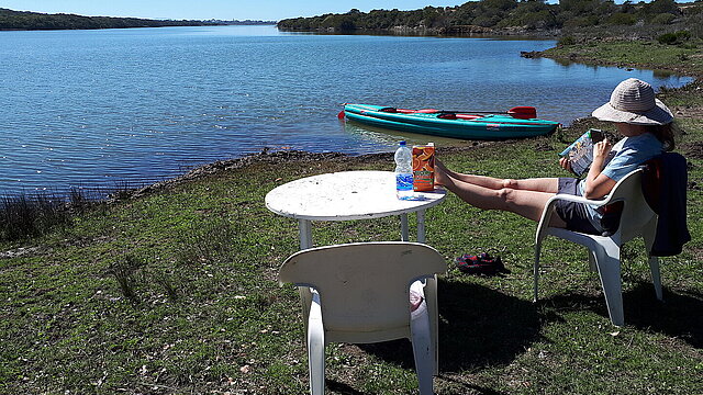 Wir bepackten den Grabner RIVERSTAR mit der umfangreichen Ausrüstung, die wasserdicht in Rollsäcken, Tonnen, Taschen und dem großen Trockenrucksack untergebracht war. Mit dem Bootswagen transportierten wir das Kajak zum Wasser und paddelten endlich los. Die erste Nacht wollten wir fern vom Campingplatz und dem Menschentrubel im Zelt auf einer Insel verbringen. Gesagt, getan. Obwohl es zu unserem Aufbruch schon nach 18 Uhr war, hatten wir (Anfänger-)Glück. Nach wenigen Paddel-Kilometern fanden wir auf einer Insel eine wunderschöne Bucht. Sandstrand, Feuerstelle und ein geschützter Zeltplatz unter den Bäumen. Camperherz, was willst du mehr! Wir konnten unser Glück kaum fassen. Im Nachhinein waren wir uns einig, dass dieser erste Zeltplatz unser schönster sein sollte.