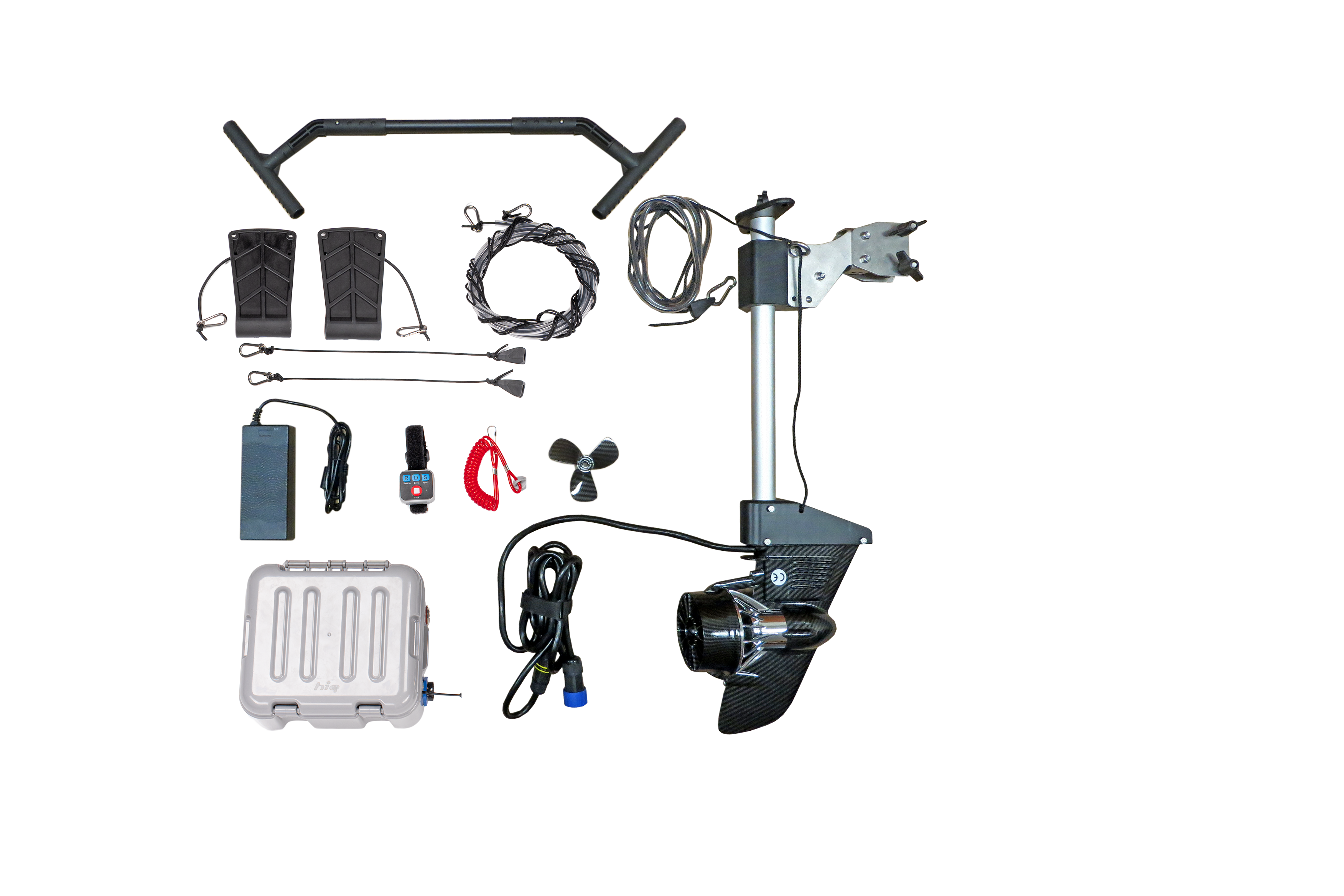 If the motor touches the bottom, it automatically folds back. To land, pull it out of the water using the uphaul line.