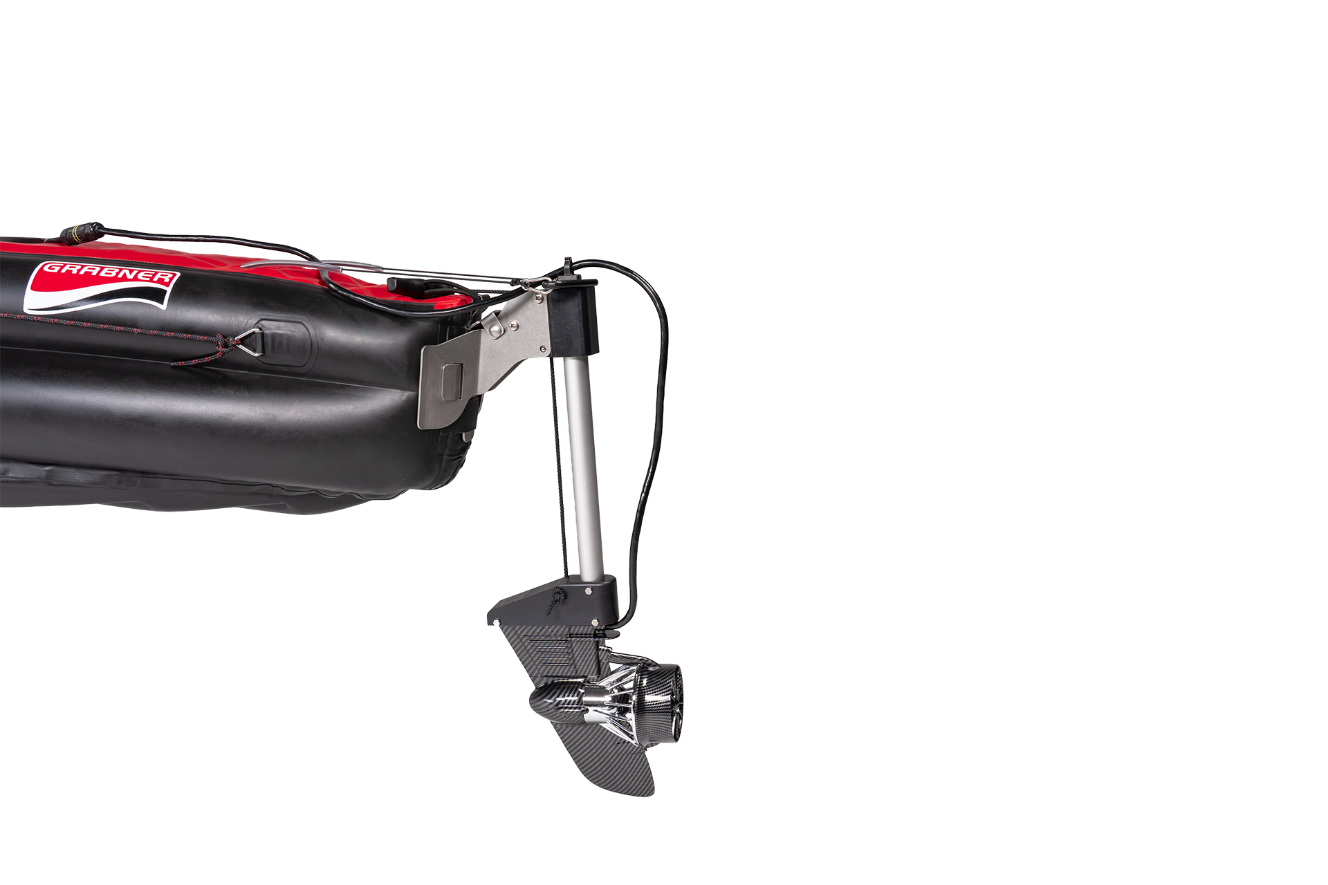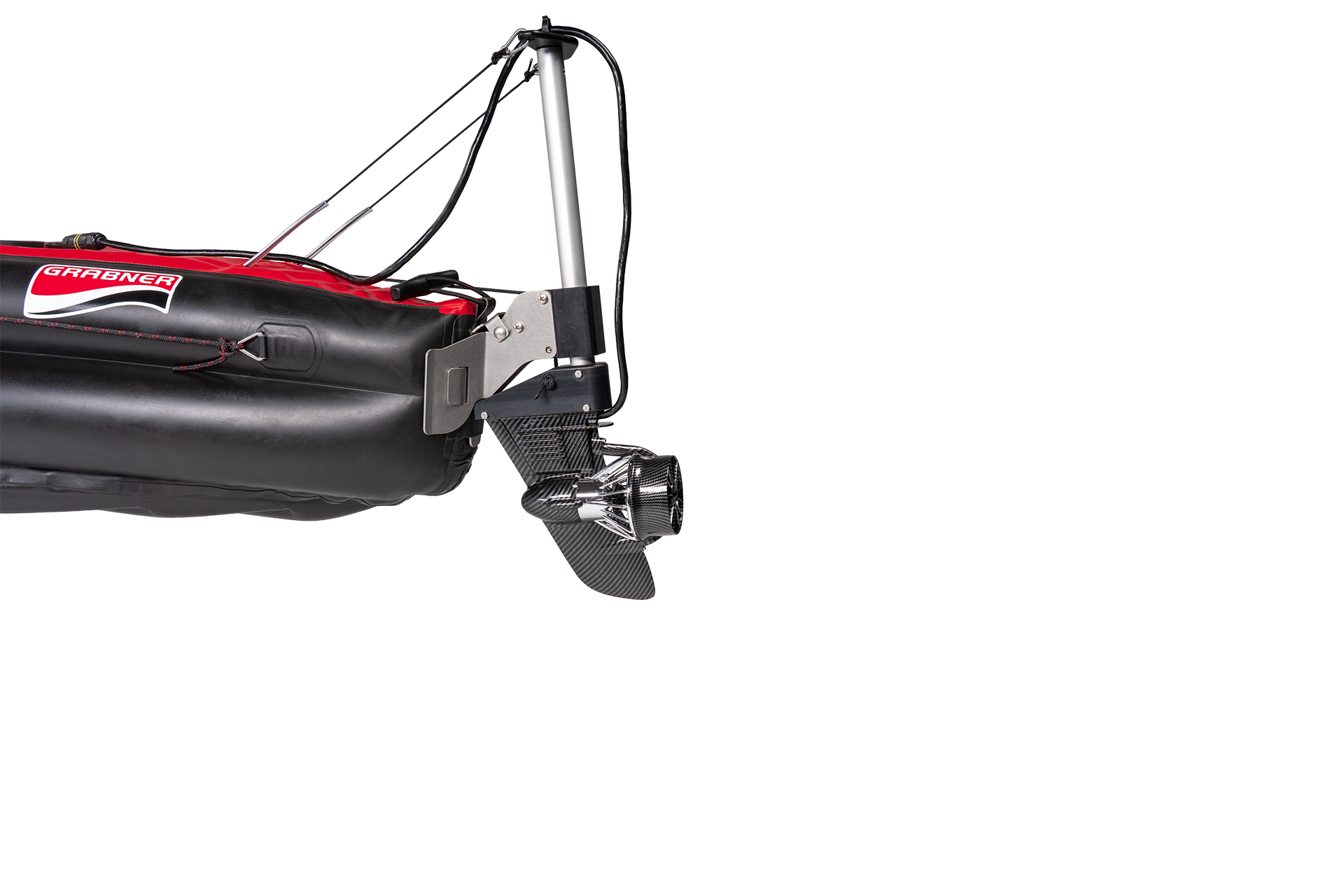 If the motor touches the bottom, it automatically folds back. To land, pull it out of the water using the uphaul line.