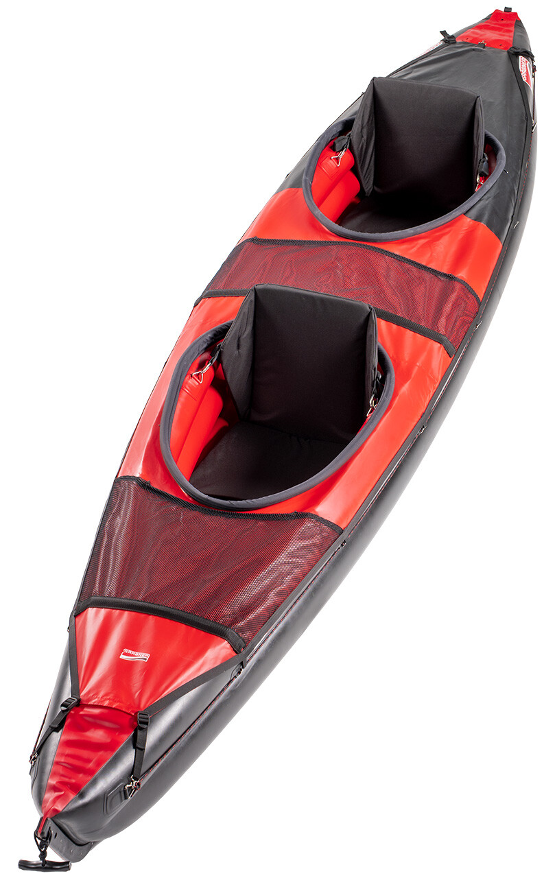 The spraycover stretches across the entire boat top side. It is made of waterproof material that dries quickly, letting you pack it away right after paddling. The hatch rings can be removed for packaging and divided into 2 parts. Two built-in crossbars keep the deck tight so water runs off easily. In front of the hatch is a handy mesh net for a water bottle or small items.