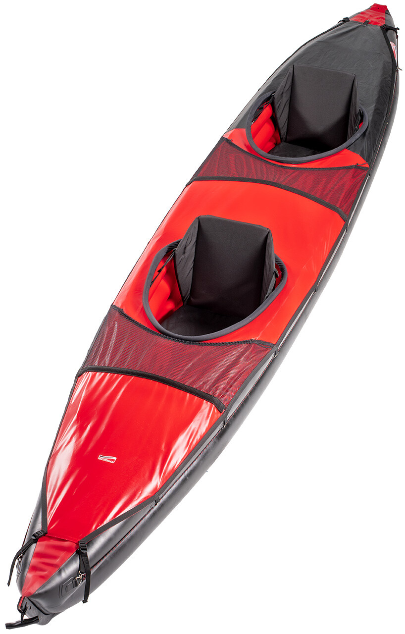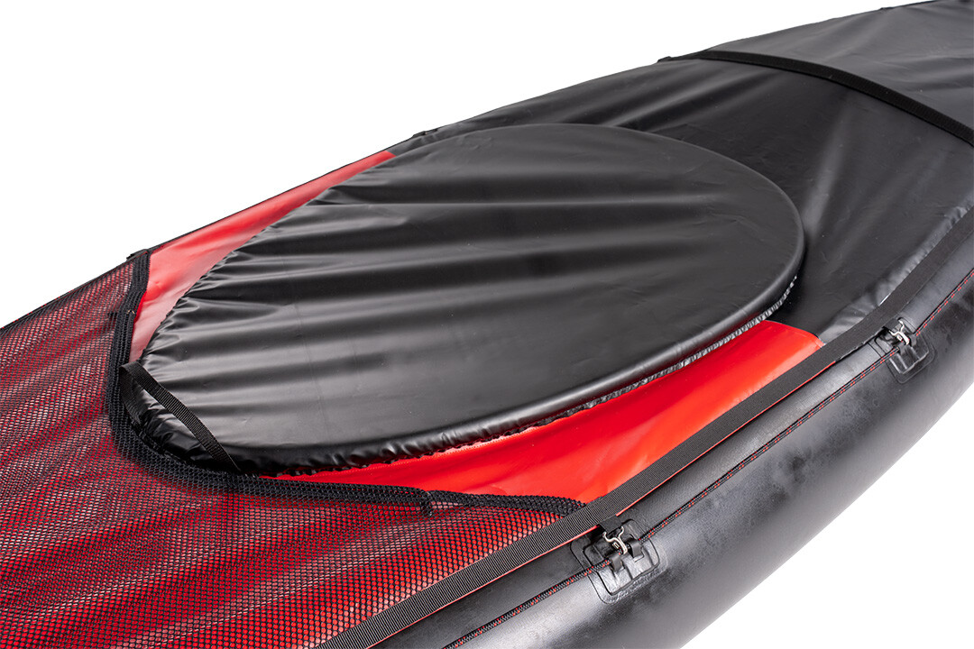The spraycover stretches across the entire boat top side. It is made of waterproof material that dries quickly, letting you pack it away right after paddling. The hatch rings can be removed for packaging and divided into 2 parts. Two built-in crossbars keep the deck tight so water runs off easily. In front of the hatch is a handy mesh net for a water bottle or small items.